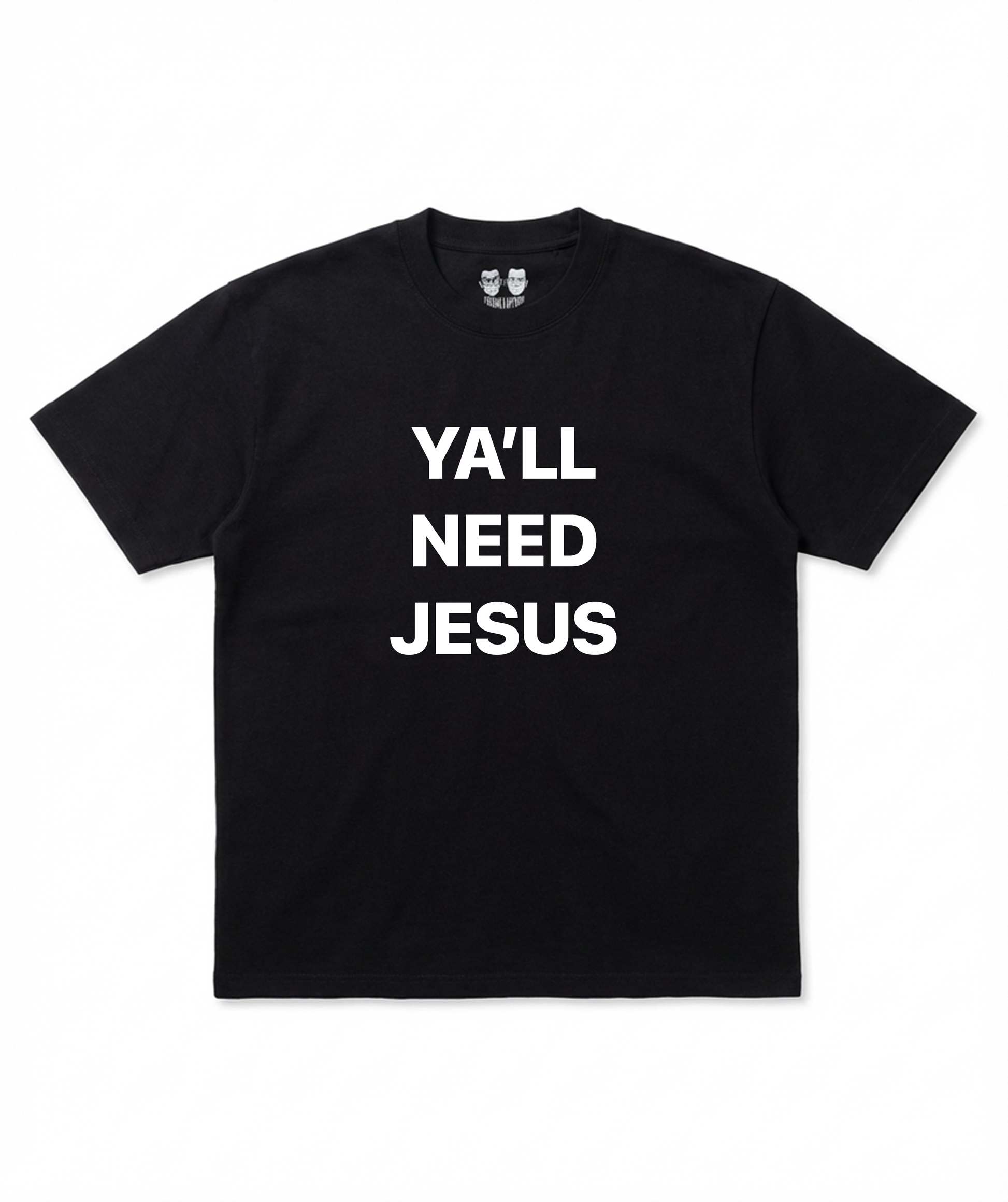YA’LL NEED JESUS. No gradient. No chrome. Just straight talk. White type on black. Reads like a headline. Hits like a warning. Wear it calm. Let it speak.